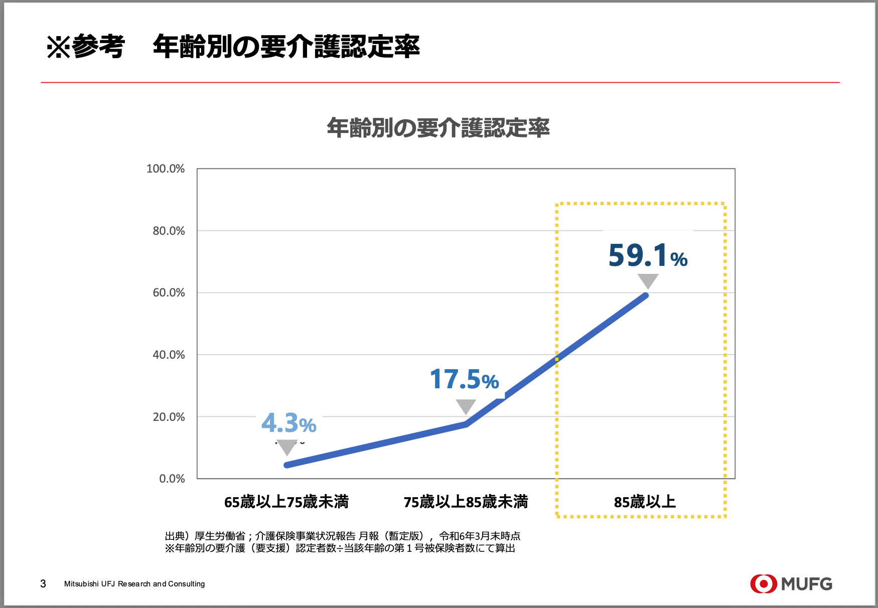 前期高齢者(65~74歳)で要介護認定を受ける方は4.3%ですが、85歳以上ではその割合が6割近くにまで跳ね上がります。