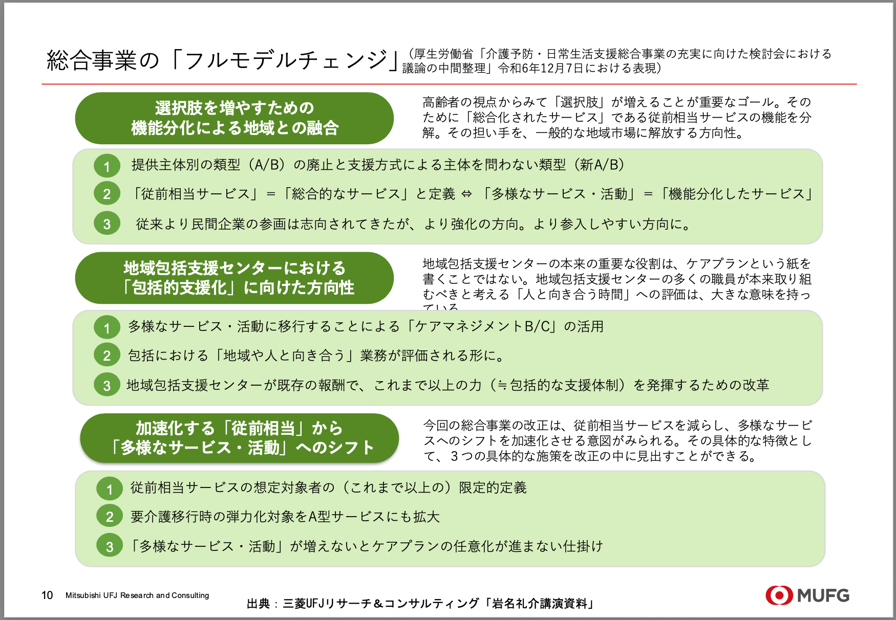 今回の改革は、従前相当サービスを「総合的なサービス」と定義しなおしたことで、それに対して「機能分化したサービス」という新たな概念が生まれたと私は考えています。