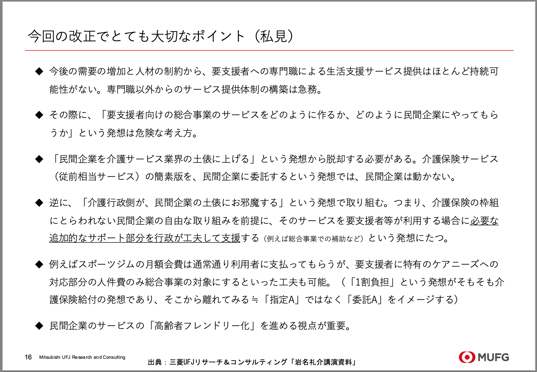 機能分化によって多様な主体に参画してもらうために、私たちの発想そのものを転換する。これまで私たちは、「介護保険の土俵に民間企業に乗ってきてもらう」と考えてきました。