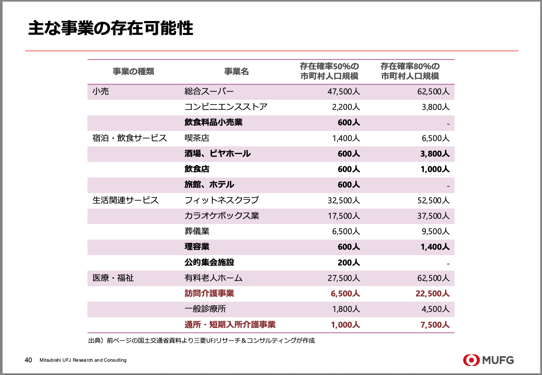 特定の事業所(スーパー、介護事業所など)が存在するためには、ある程度の人口規模が必要です。国土交通省の資料によると、主な事業の存在確率と人口規模の関係は以下のようになっています。