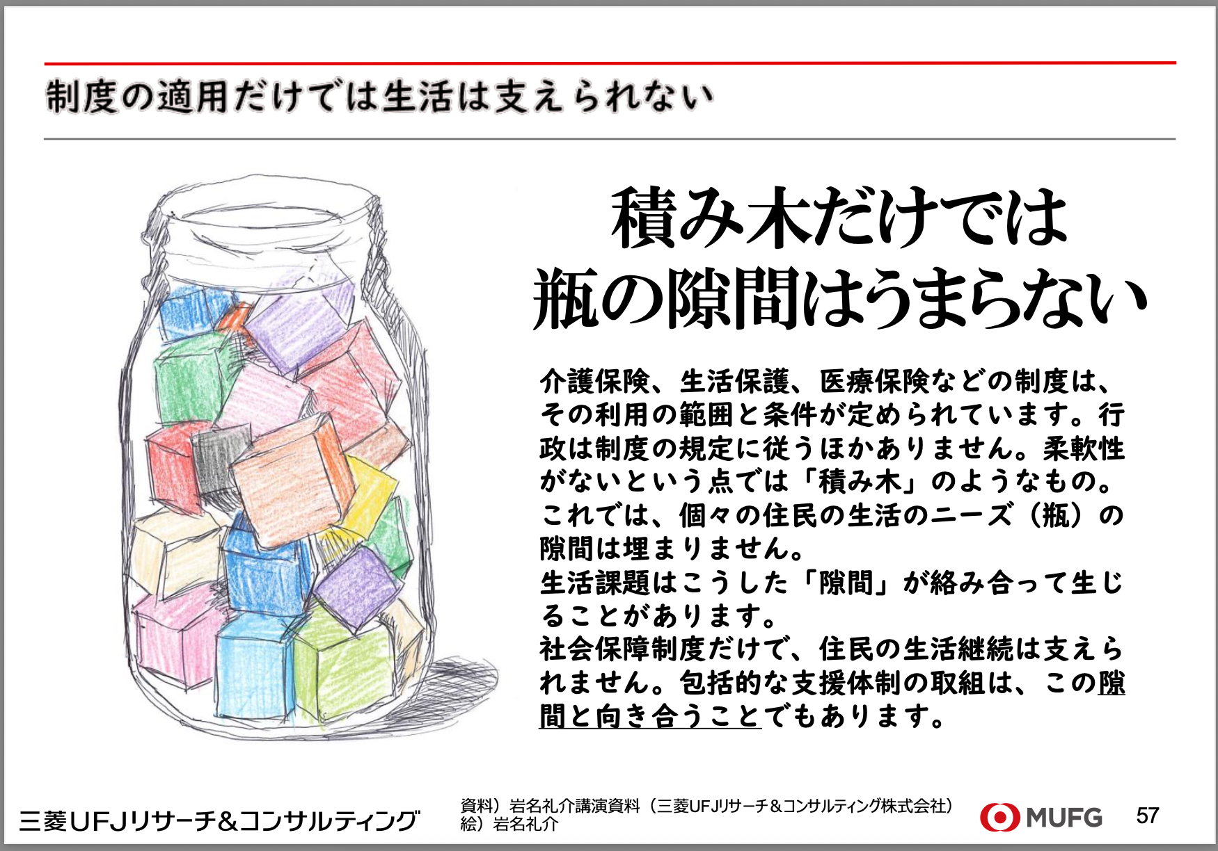 瓶がその人の抱える生活課題の大きさだとすれば、行政の制度やサービスは四角い「積み木」のようなものです。