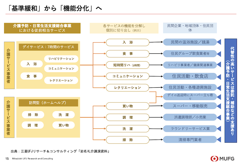 入浴・食事・リハビリといった機能を分解(機能分化)し、地域の多様な担い手が参画しやすくする方向性が示されました。