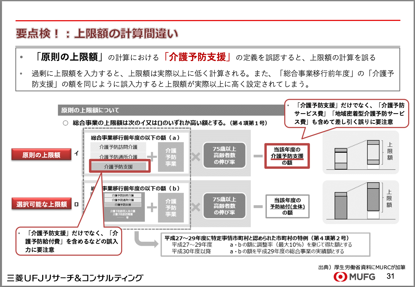 一番多い間違いが、「原則の上限額」を計算する際に差し引く「介護予防支援」の額です。ここに、総合事業以外の「介護予防サービス費」や「地域密着型介護予防サービス費」まで含めて入力してしまうと、上限額が不当に低く計算されてしまいます。逆に、移行前年度の額を同様に間違えると、上限額は不当に高くなります。