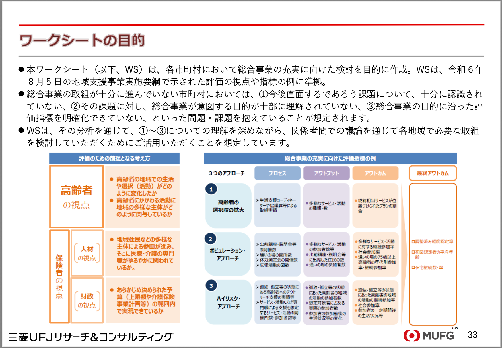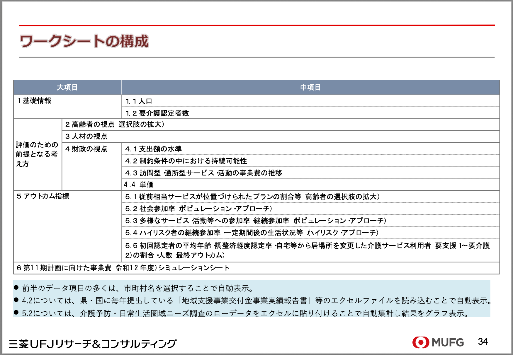これから使うのは、「総合事業の充実に向けたワークシート」というもので、三菱UFJリサーチ&コンサルティングが厚生労働省の補助金事業で作成した無料のExcelツールです。先にツールの概要を説明します。
