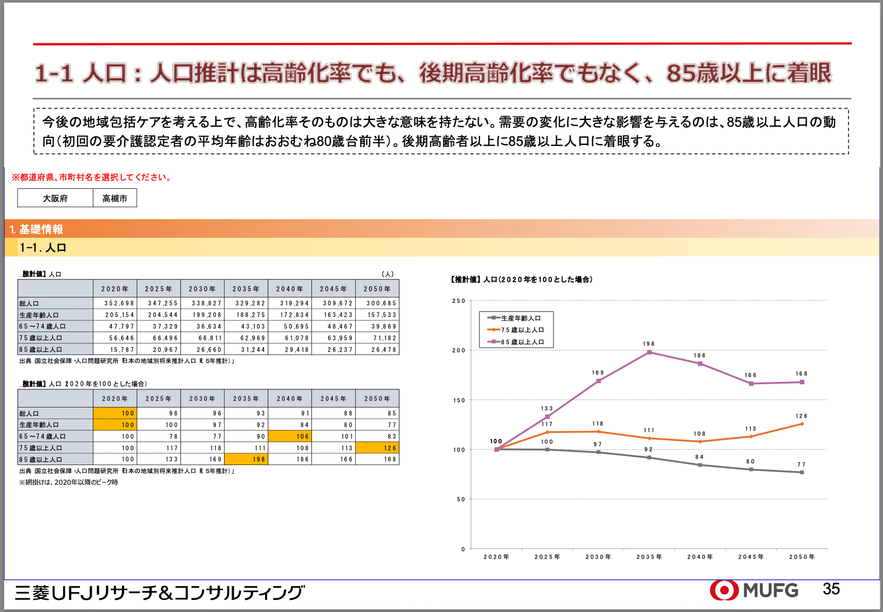 今日は高槻市を例にしていますが、別にどこでも選べます。大阪だけでなく、他の地域でも、選ぶだけで2050年までの人口の推計が全部自動的にグラフ化されて表示されるようになっています。