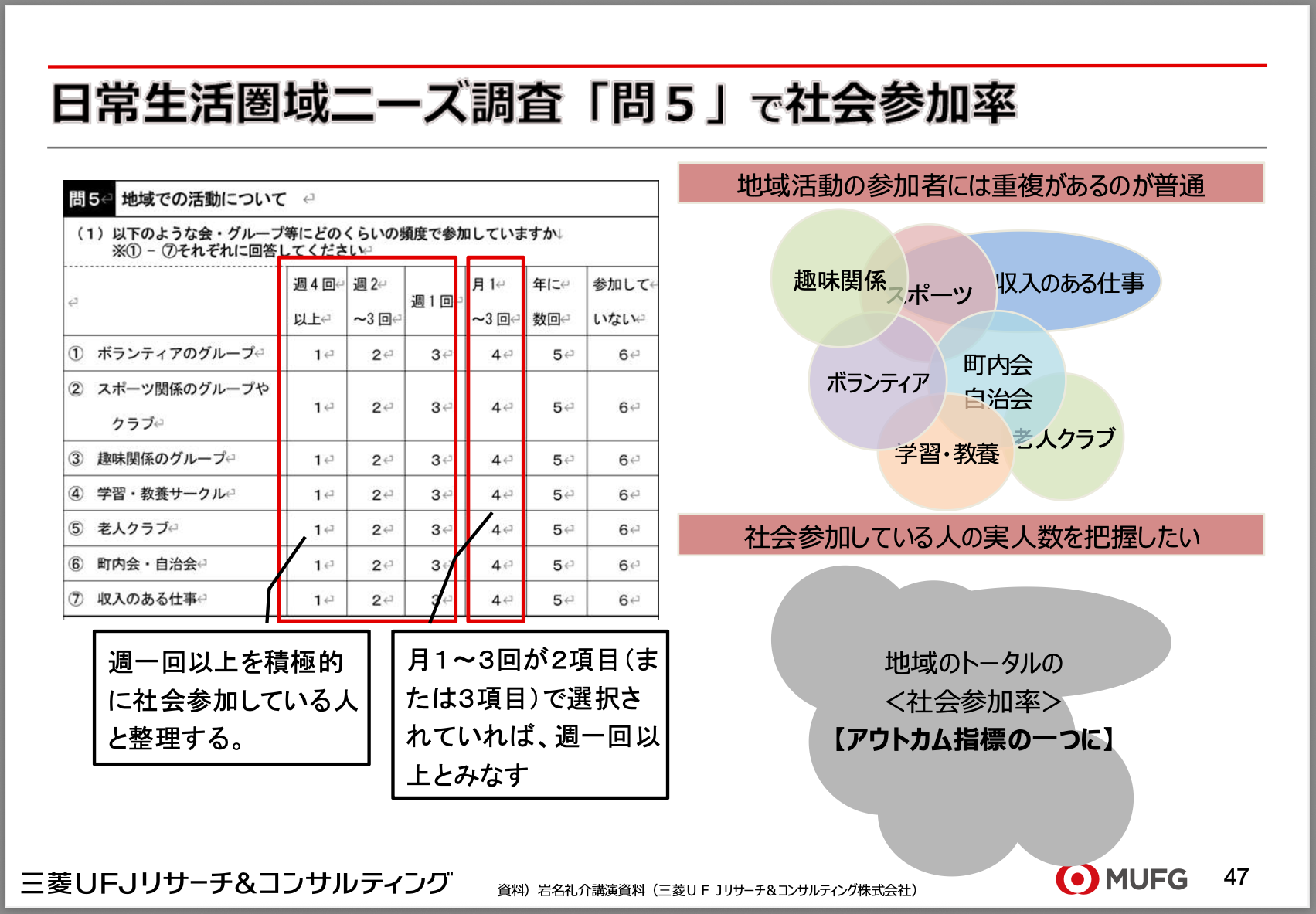 評価のポイント:アウトカムは「社会参加率」です。これは日常生活圏域ニーズ調査の「問5」(詳細は後述)のデータを分析すれば簡単に算出できます。特に、社会参加が減少しがちな75歳以上の参加率に注目することが重要です。