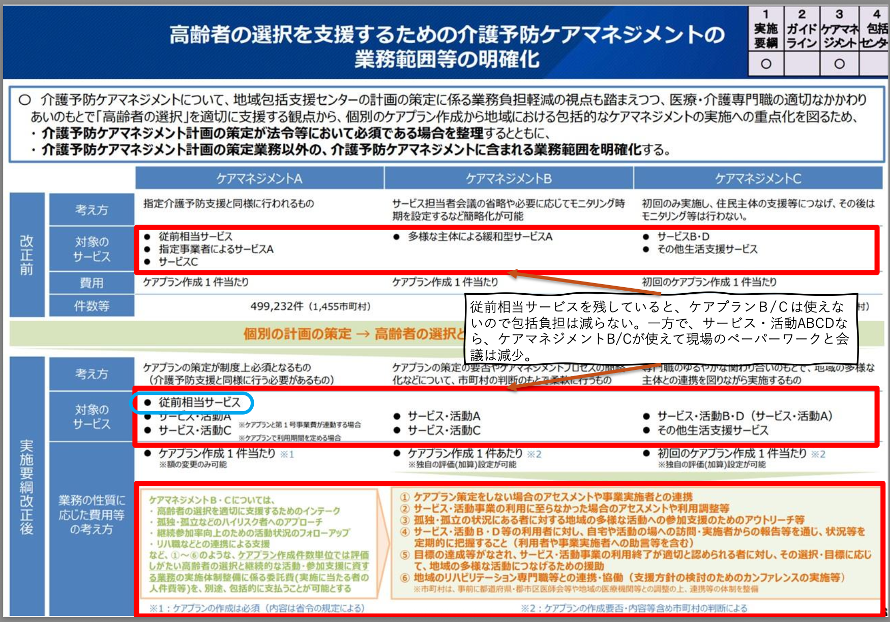 これは、パンク寸前の地域包括支援センターを救い、本来の機能を取り戻すための改革です。今回の総合事業ガイドライン改定のキーワードは「紙から人へ」であり、紙と向き合う時間を減らして、人と向き合う時間に当てようという、非常に真っ当な改革です。