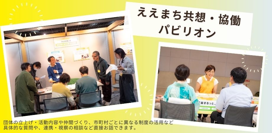 普段の活動に新たな視点が加わる基調講演をはじめとして、団体のブースを訪ねて活動者へ直接質問・相談できる「ええまち共想・協働パビリオン」や、パネルディスカッション、テーマセミナーなど、聞いたことを身近な人と話題にしたくなる内容が盛りだくさんです。