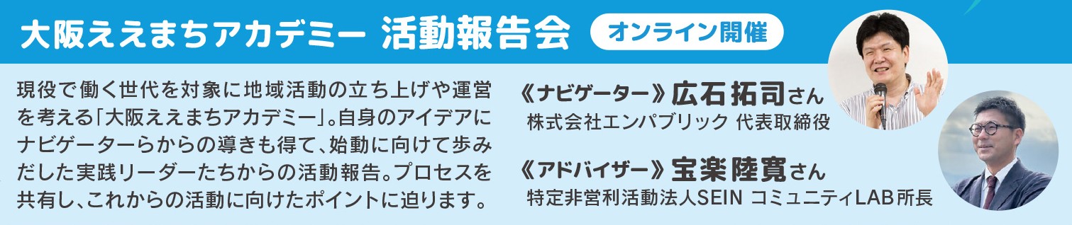 「大阪ええまちプロジェクト」で、これからの地域活動の立ち上げに取り組む「大阪ええまちアカデミー」の報告会を開催します。
