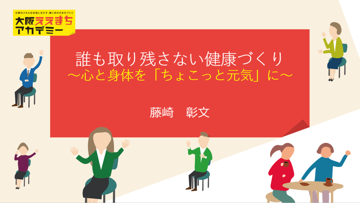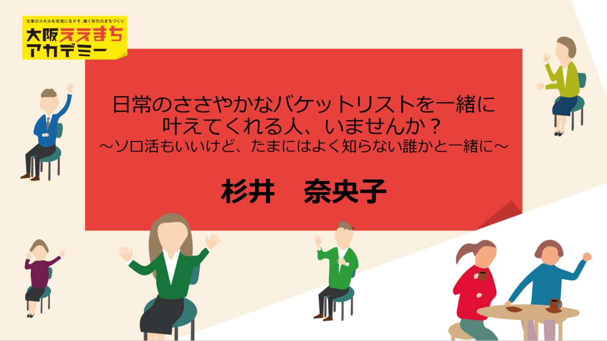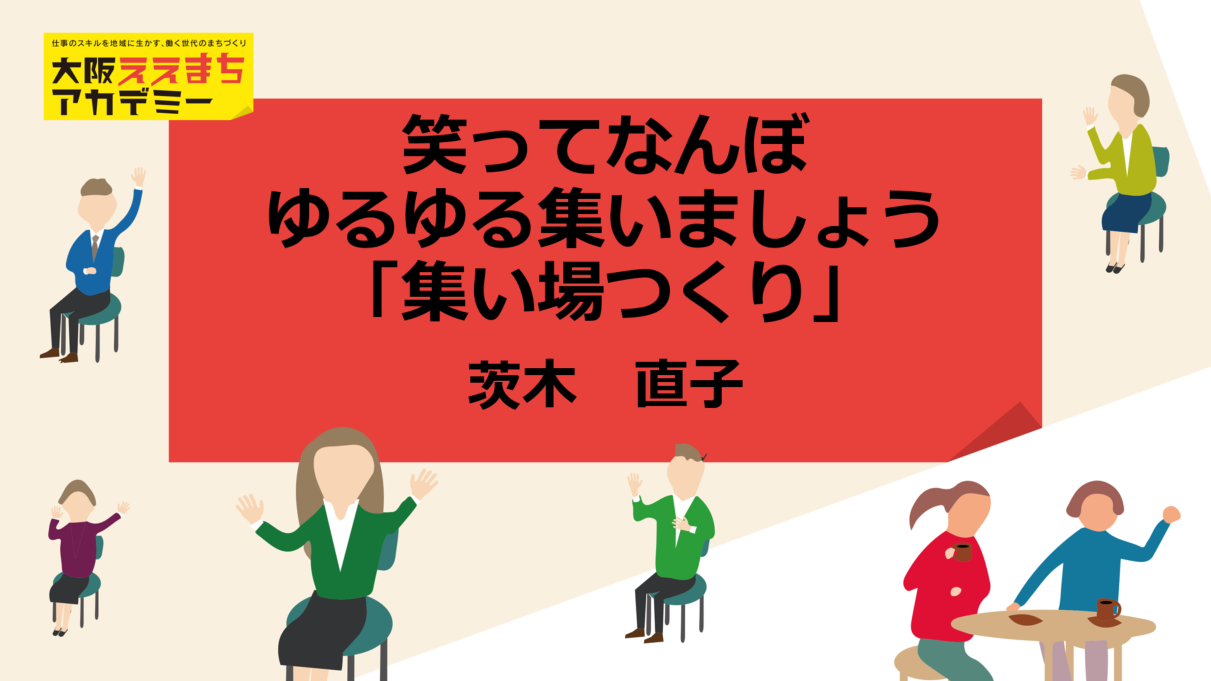 「大阪ええまちアカデミー」は、現役で働く世代を対象に、地域活動プロジェクト の立ち上げや運営などを学ぶ講座です。 「実践編」では、「地域活動をカタチにしたい!」と考える方が提案する地域活動 のプランを具体化して実践につなげることを目指します。